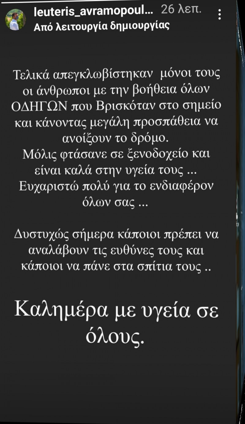 Νέα ενημέρωση: Οι οδηγοί, όπως και ο συμπολίτης μας κ. Αβραμόπουλος απεγκλωβίστηκαν μόνοι τους με την βοήθεια άλλων οδηγών και οδηγήθηκαν σε ξενοδοχείο και είναι καλά στην υγεία τους, όπως εκανε γνωστό ο Λευτέρης Αβραμόπουλος σήμερα το πρωί.