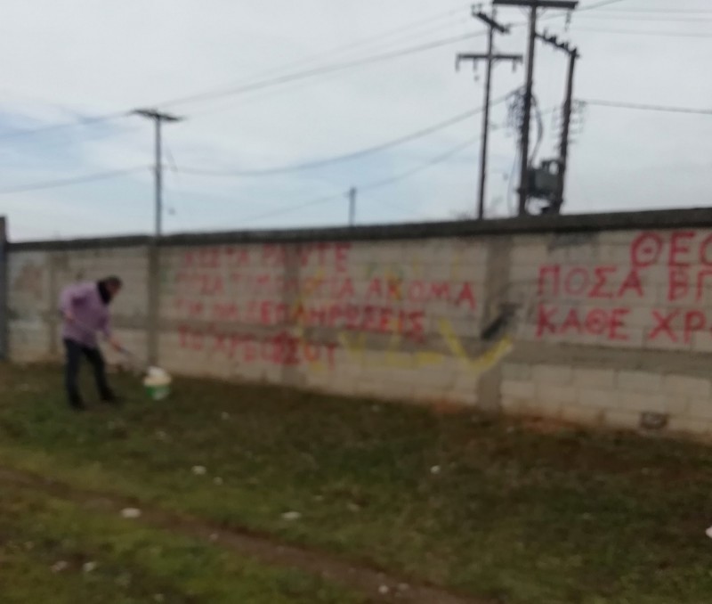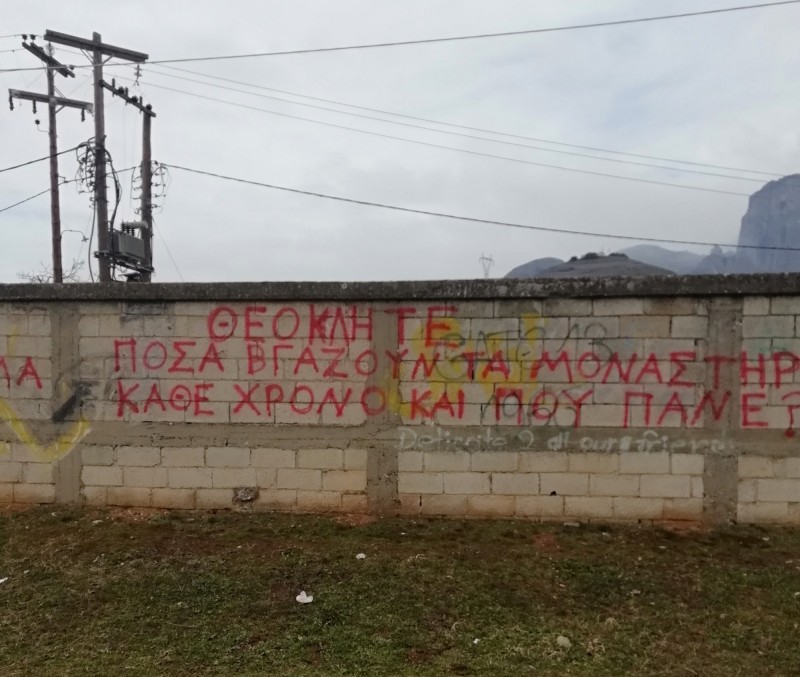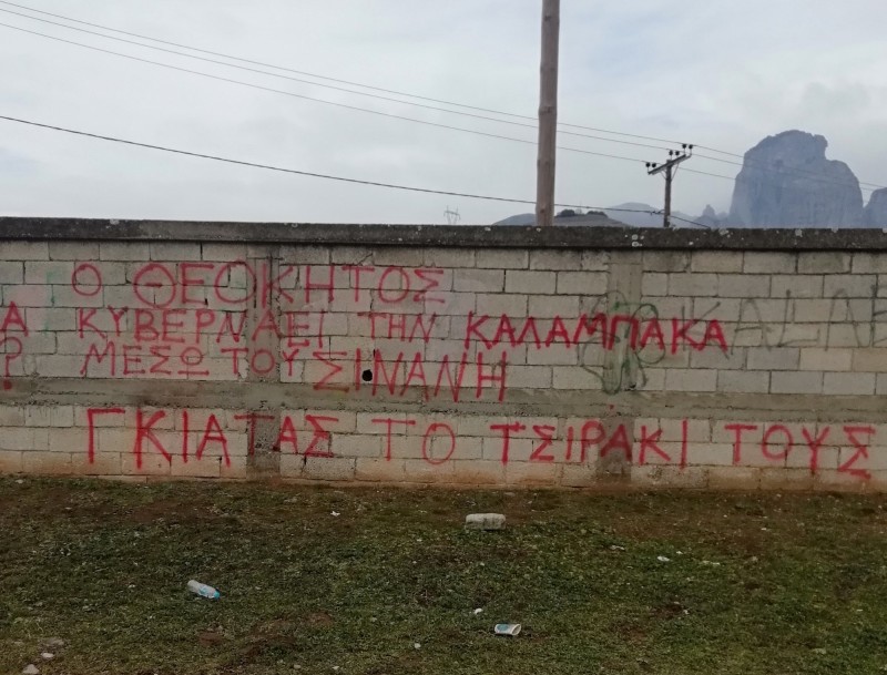 Στον τοίχο εσωτερικά του γηπέδου άγνωστοι εγραψαν συνθήματα – οπως και πριν λιγο καιρό – για τον Μητροπολίτη Σταγών και Μετεώρων κ. Θεόκλητο, για τον αντιδήμαρχο κ. Ράντο, κ.α.
