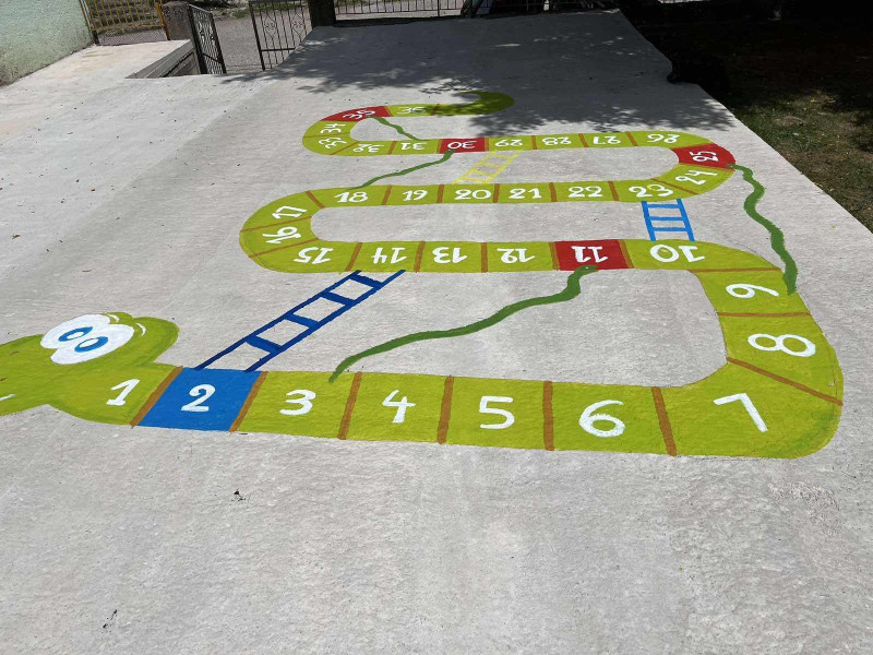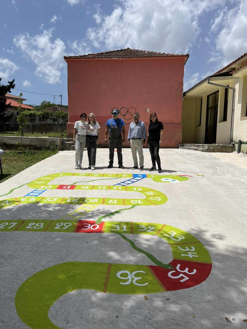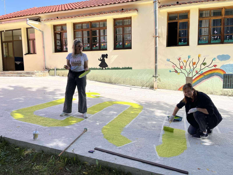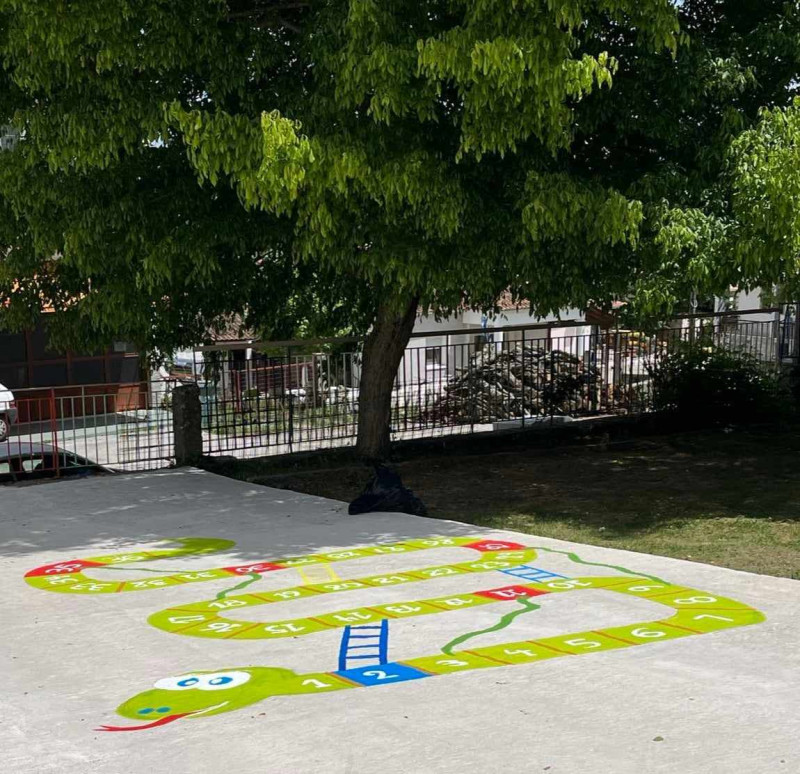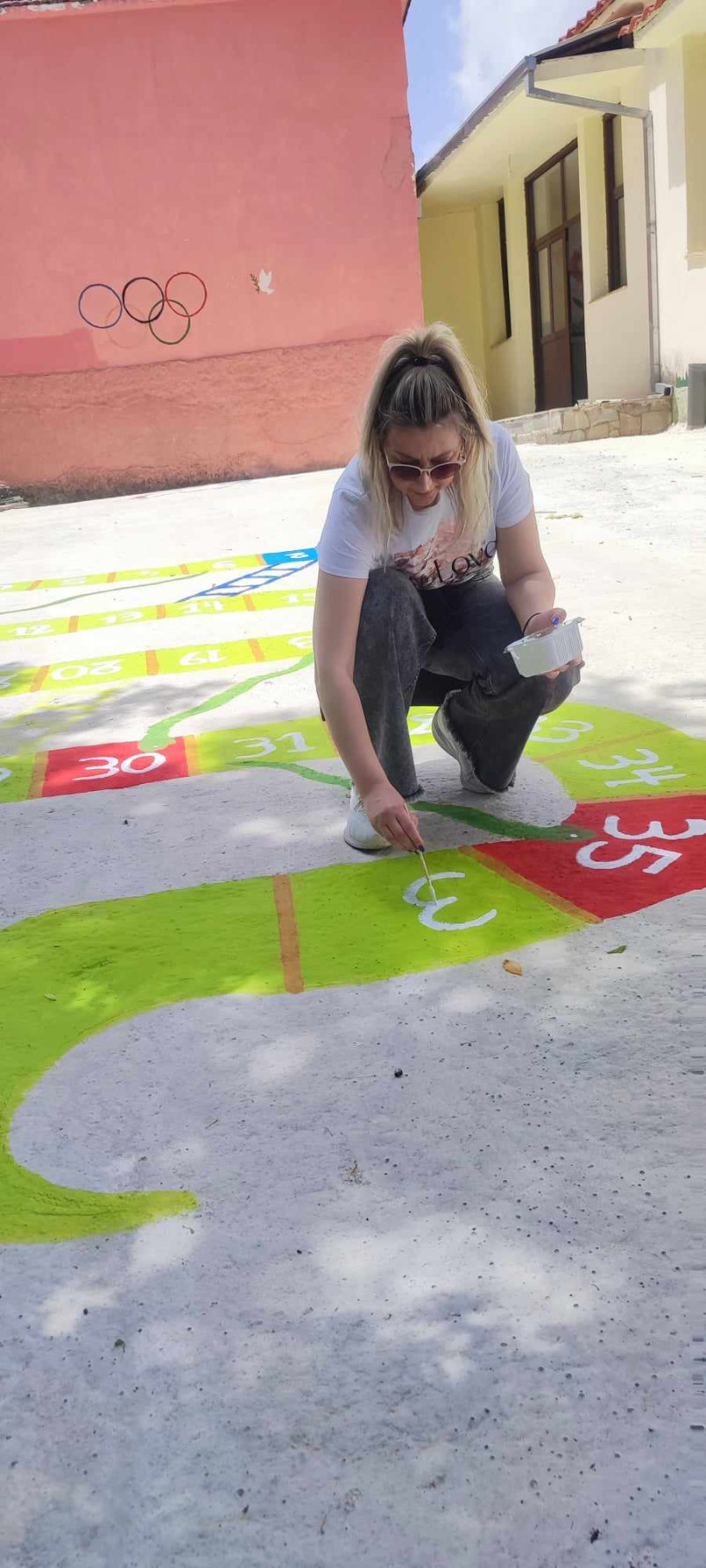 Τον εξωραϊσμό της αυλής του σχολείου ανέλαβε η αγιογράφος και εικαστικός Φανή Καραγγέλη, ανταποκρινόμενη στο κάλεσμα, σχεδιάζοντας και ζωγραφίζοντας επιδαπέδια παιχνίδια για τους μικρούς μαθητές – και όχι μόνο!