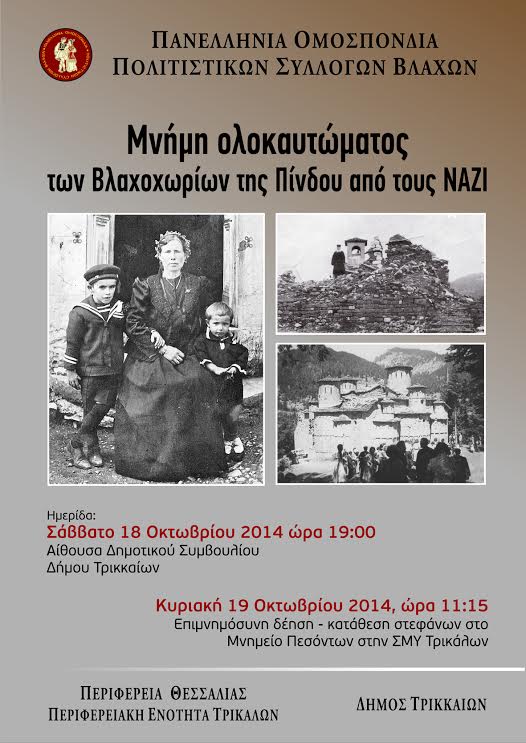 Στα πλαίσια των δραστηριοτήτων μας, θα λάβουν χώρα εκδηλώσεις Μνήμης ολοκαυτώματος των Βλαχοχωρίων της Πίνδου από τους ΝΑΖΙ στα Τρίκαλα .