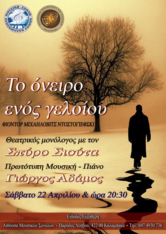 Το αριστούργημα του Φιοντόρ Ντοστογιέφσκι « Το όνειρο ενός γελοίου» ,ανεβάζει το Θεατρικό Εργαστήρι Επί Σταγών . Ένας χαρακτήρας που συνομιλεί με τον εαυτό του, ένας γελοίος άνθρωπος, που δεν είναι παρά ένας κοινός θνητός , μια ταλαιπωρημένη ψυχή , ένας Χριστός της καθημερινότητας μέσα σε μια κοινωνία που δεν έχει κατανόηση και χώρο γα το διαφορετικό.