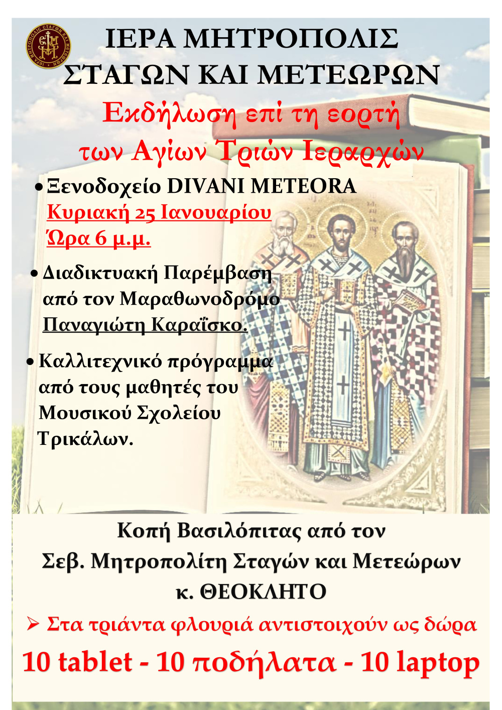 Η Ιερά Μητρόπολις Σταγών και Μετεώρων διοργανώνει εκδήλωση για τους μαθητές και εκπαιδευτικούς της επαρχίας της, με αφορμή την εορτή των Αγίων Τριών Ιεραρχών, προστατών της ελληνικής Παιδείας, η οποία θα λάβει χώρα στην μεγάλη αίθουσα εκδηλώσεων του Ξενοδοχείου Divani Meteora, στην Καλαμπάκα, την Κυριακή 25 Ιανουαρίου 2026 στις 6 μ.μ.