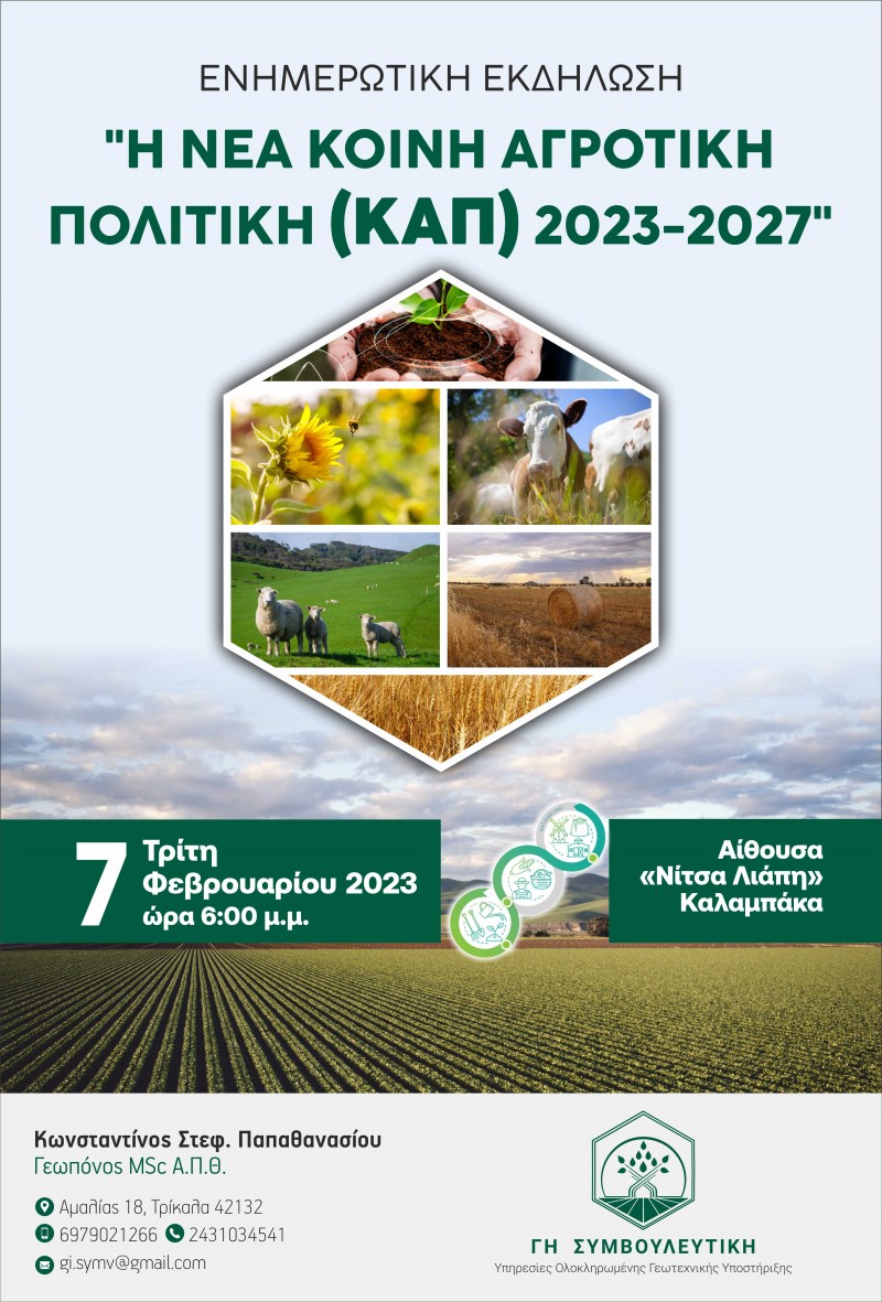 Μια ενδιαφέρουσα ενημερωτική εκδήλωση για αγρότες, κτηνοτρόφους και μελισσοκόμους θα πραγματοποιηθεί την Τρίτη 7 Φεβρουαρίου 2023 και ώρα 6.00 μ.μ. στην ΚΑΛΑΜΠΑΚΑ στην αίθουσα «Νίτσα Λιάπη» με θέμα την Νέα Κοινή Αγροτική Πολιτική (ΚΑΠ) 2023-2027.