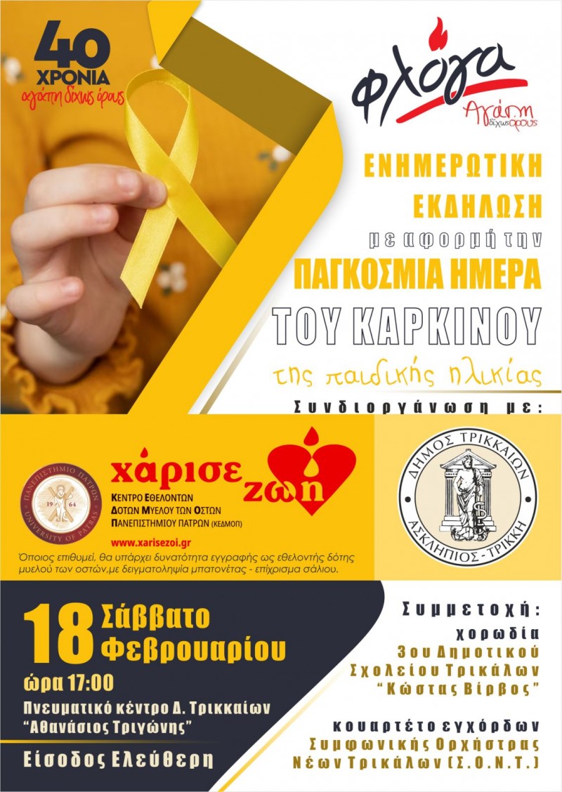 Ενημερωτική εκδήλωση με αφορμή την Παγκόσμια Ημέρα του καρκίνου της Παιδικής Ηλικίας διοργανώνει στα Τρίκαλα ο Σύλλογος Γονιών Παιδιών με Νεοπλασματική Ασθένεια «Φλόγα» (παράρτημα Τρικάλων).