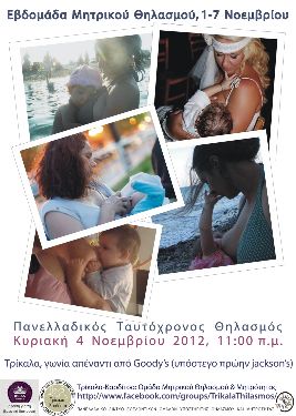 Στα πλαίσια του εορτασμού της Παγκόσμιας Εβδομάδας Μητρικού Θηλασμού*, 1-7 Νοεμβρίου 2012, το Δίκτυο των Ομάδων Υποστήριξης Μητρικού Θηλασμού και Μητρότητας, σας προσκαλεί την Κυριακή 4 Νοεμβρίου 2012, σε μια εκδήλωση γιορτή για τον μητρικό θηλασμό, στην πόλη των Τρικάλων!