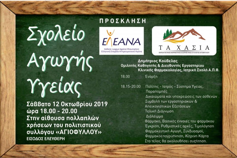 Εκδήλωση ενημέρωσης και ευαισθητοποίησης του κοινού και των επαγγελματιών υγείας, με τίτλο «Σχολείο Αγωγής Υγείας», οργανώνει η Ελληνική Εταιρεία Αντιρευματικού Αγώνα (ΕΛ.Ε.ΑΝ.Α) σε συνεργασία με τον Εκπολιτιστικό Μορφωτικό Εξωραϊστικό Σύλλογο Αγιοφύλλου « ΤΑ ΧΑΣΙΑ», το Σάββατο 12 Οκτωβρίου 2019 και ώρες 18:00-20:00 στην αίθουσα πολλαπλών χρήσεων που πολιτιστικού συλλόγου « ΑΓΙΟΦΥΛΛΟΥ».