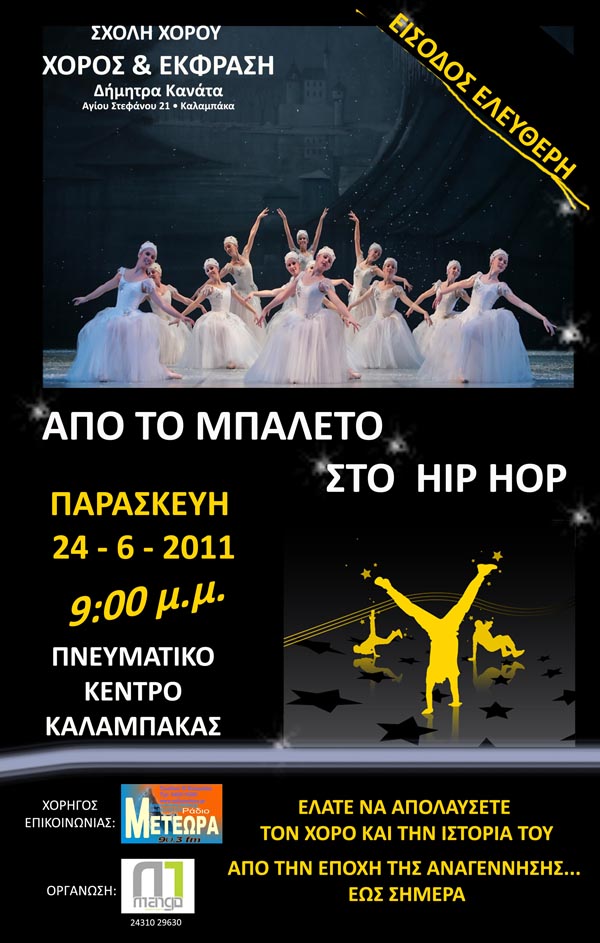 Από το μπαλέτο στο  hip hop, ο κλασικός χορός και η ιστορία του. Από το μεσαίωνα έως σήμερα” Αυτός είναι ο τίτλος της σχολής χορού της Δήμητρας Κανάτα «ΧΟΡΟΣ & ΕΚΦΡΑΣΗ» για τη λήξη της φετινής χρονιάς. Η σχολή σας προσκαλεί την Παρασκευή 24 Ιουνίου 2011 στις 9:00 μ.μ. στο Πολιτιστικό Κέντρο Καλαμπάκας, για να σας ταξιδέψει στο χρόνο και τα παιδιά να σας παρουσιάσουν με έναν μοναδικό τρόπο την ιστορία του χορού από την εποχή της Αναγέννησης έως και σήμερα. Ελάτε να γνωρίσετε τις διάφορες μορφές του χορού μέσα στην πάροδο των χρόνων και των δεκαετιών, την εξέλιξη του, τις επιρροές που δέχτηκε και τις εναλλαγές του. Τις επιρροές του από την μόδα, την βιομηχανική επανάσταση και την παγκοσμιοποίηση!
