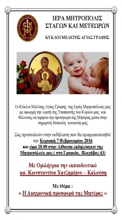 και θέλοντας να τιμήσει την προσφορά της Μητέρας μέσα στην σημερινή δύσκολη κοινωνίας μας σας προσκαλούν στην εκδήλωση που θα πραγματοποιηθεί την Κυριακή 7 Φεβρουαρίου 2016 και ώρα 18:00 στην αίθουσα εκδηλώσεων της Μητροπόλεως μας ( στα γραφεία, Βλαχάβας 43 ).