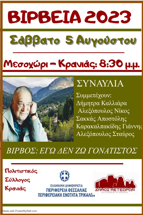 Η εκδήλωση έχει τον τίτλο «ΒΙΡΒΕΙΑ 2023: Κώστας Βίρβος: Εγώ δεν ζω γονατιστός» και  τελεί υπό την αιγίδα της Περιφέρειας Θεσσαλίας, Περιφερειακής Ενότητας Τρικάλων και του Δήμου Μετεώρων.