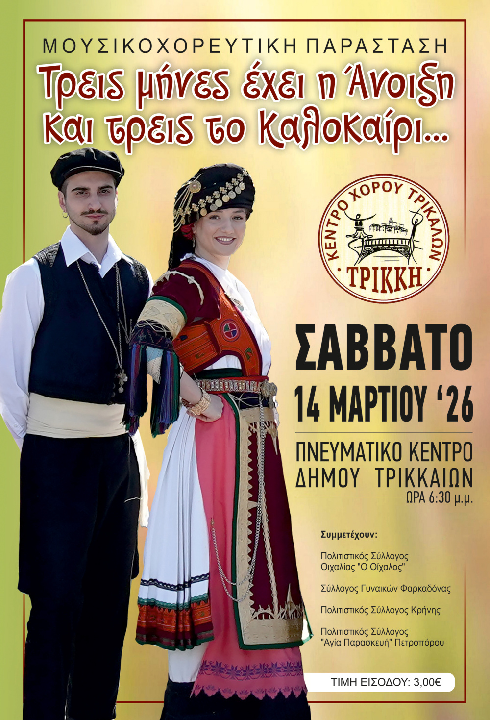Η «Τρίκκη» Κέντρο Χορού Τρικάλων σας προσκαλεί σε μια ξεχωριστή μουσικοχορευτική παράσταση γεμάτη χρώματα, ρυθμούς και αρώματα Ελλάδας!
