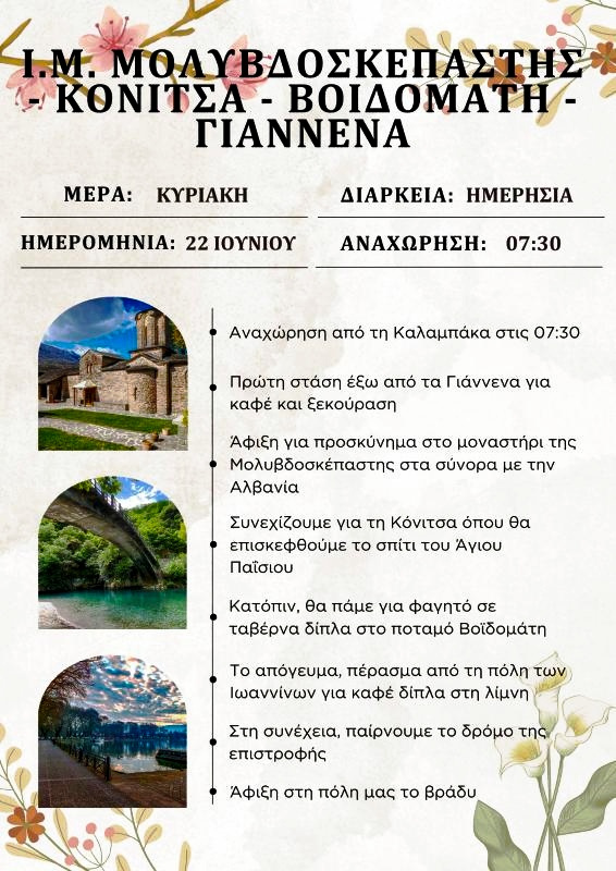 Αναχώρηση: 07:30 π.μ. από την Εθνική Τράπεζα Καλαμπάκας
