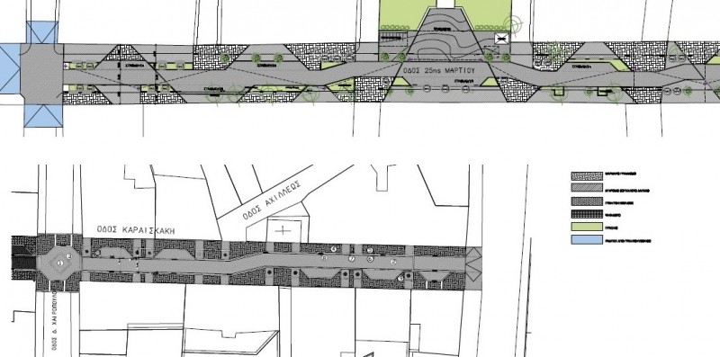 1. Υψομετρική ενοποίηση του οδοστρώματος και των πεζοδρομίων της οδού 25ης Μαρτίου και στο τμήμα αυτής από την οδό Νικοτσάρα έως την οδό Ερμού, με σαφή διαχωρισμό της κυκλοφορίας των οχημάτων από τον χώρο κυκλοφορίας πεζών.