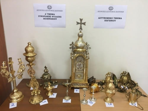 Ειδικότερα, μετά από πληροφορίες η αστυνομία εντόπισε σε κρύπτη μέσα σε δύσβατη περιοχή στη γραμμή των συνόρων με την Αλβανία δύο σακίδια μέσα στα οποία βρίσκονταν, ένα καντήλι Αγίας Τράπεζας με βάση, τρικέρι και δύο μυροδοχεία, θυμιατό και λιβανιστήρι, σταυρός αγιασμού, ιερό αρτοφόριο Αγίας Τράπεζας, δύο κηροπήγια και τέσσερις καντήλες.