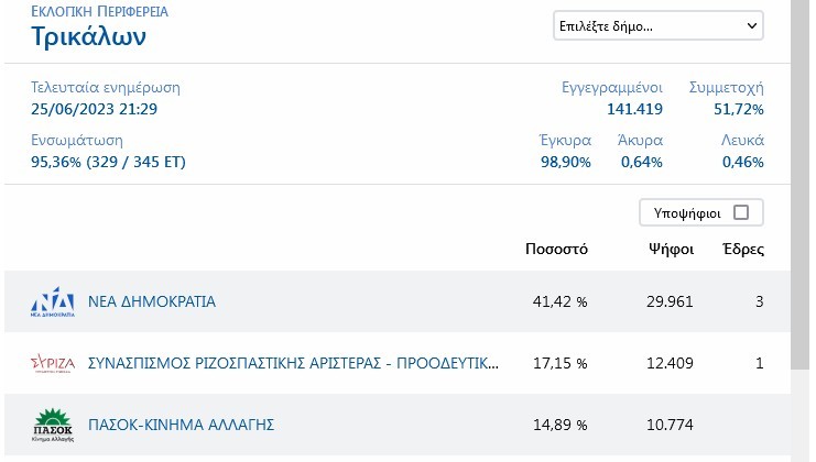 Εκλογές 2023 Π.Ε Τρικάλων: 3 έδρες η Ν.Δ – 1 ο ΣΥΡΙΖΑ