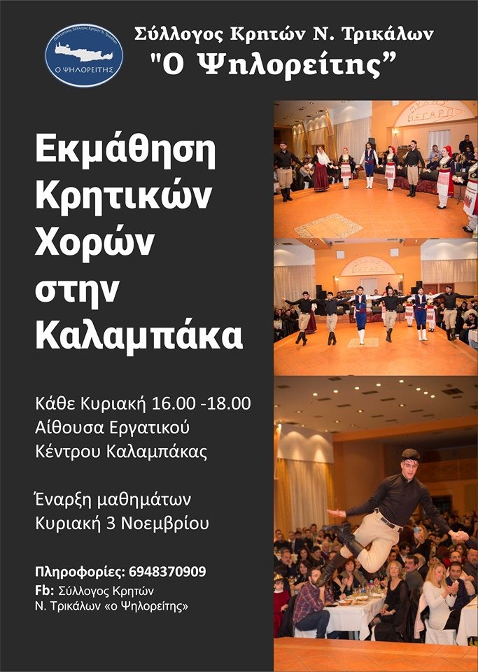 Εκμάθηση Κρητικών Χορών στην Καλαμπάκα Ανακοινώσεις Από admin Δημοσίευση Νοέ 6, 2019 -21:43 0 813 Κοινοποίηση FacebookTwitterΗλεκτρονικό ΤαχυδρομείοViber Εκμάθηση Κρητικών Χορών στην Καλαμπάκα κάθε Κυριακή 16:00 με 18:00 στην αίθουσα του Εργατικού Κέντρου Καλαμπάκας από τον Σύλλογο Κρητών Νομού Τρικάλων “Ο Ψηλορείτης”. 0 813 Κοινοποίηση