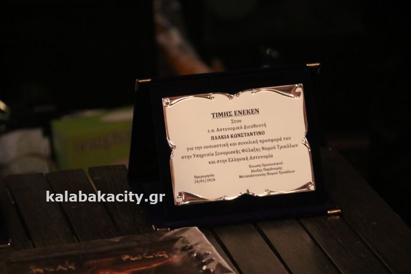 Στην όμορφη εκδήλωση βραβεύτηκε ο Αντιστράτηγος ε.α. κ. Καραπιπέρης Βασίλειος για το ήθος και την προσφορά του στην Ελληνική Αστυνομία και ο ε.α. Αστυνομικός Διευθυντής και πρώην Διοικητής του Α.Τ Καλαμπάκας κ. Πλακιάς Κωνσταντίνος για το ήθος του και την συνολική προσφορά στην Ελληνική Αστυνομία.