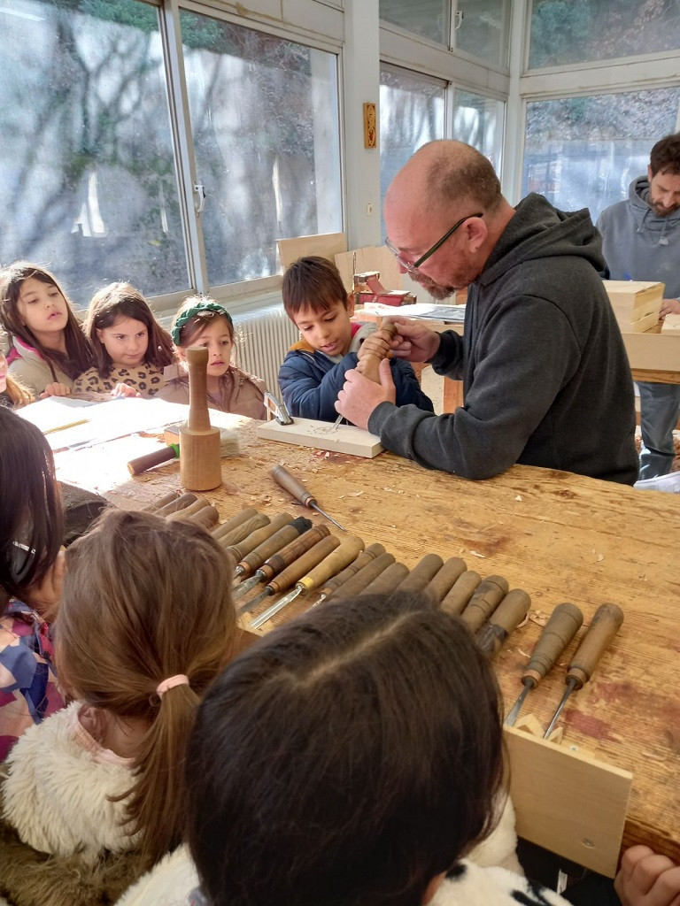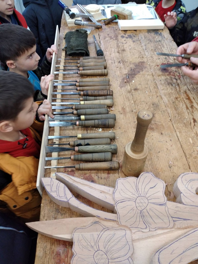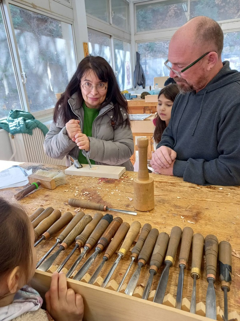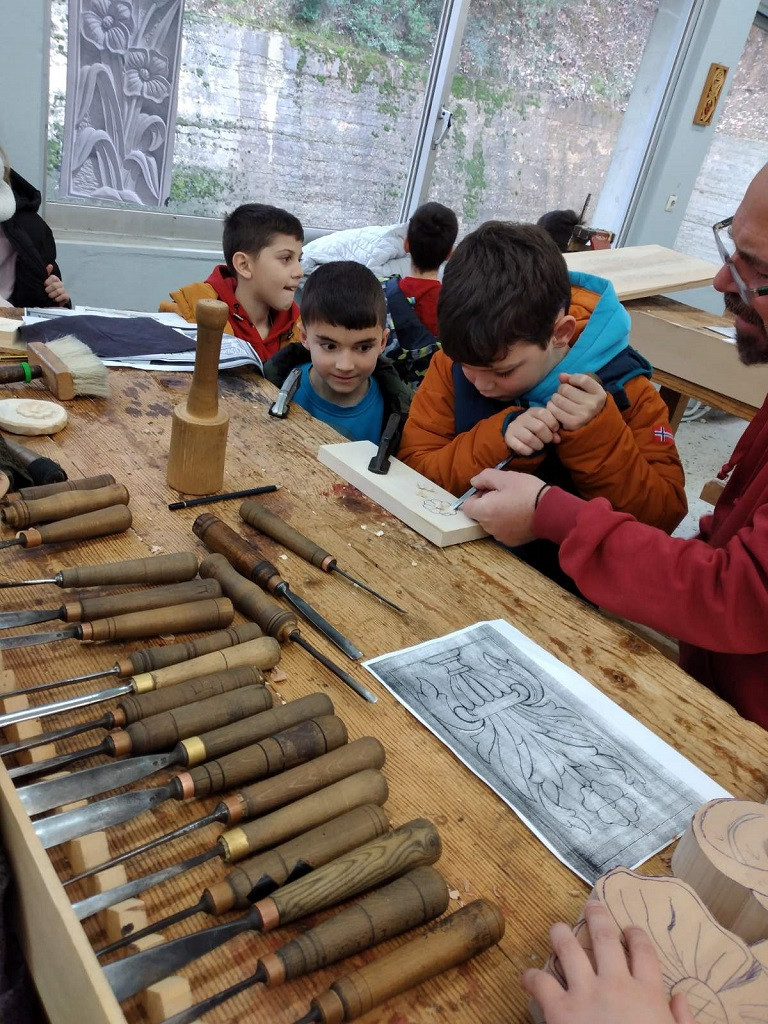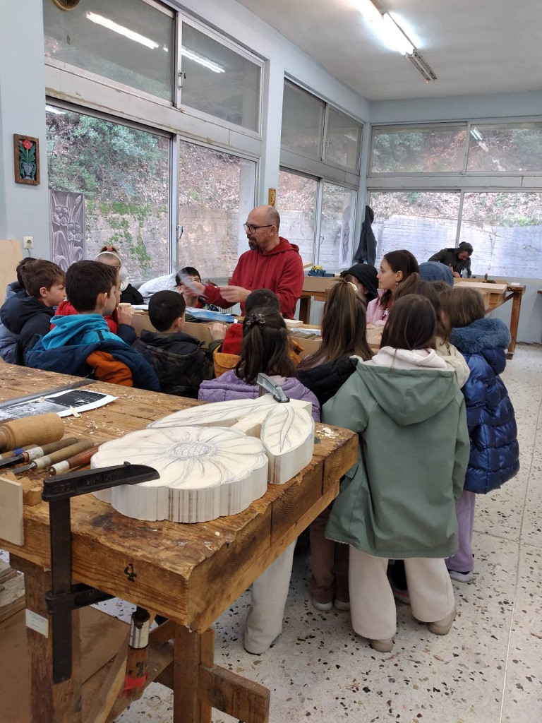 Στη συνέχεια στο εργαστήριο της σχολής, με την καθοδήγηση και τη βοήθεια του καθηγητή κυρίου Αντώνη Καραμούτσιου, έφτιαξαν όλοι μαζί ένα μικρό ξυλόγλυπτο.