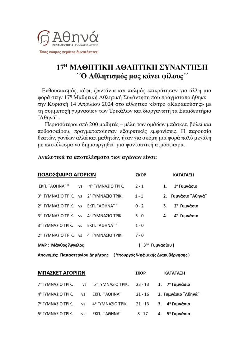 Ενθουσιασμός, κέφι, ζωντάνια και παλμός επικράτησαν για άλλη μια  φορά στην 17η Μαθητική Αθλητική Συνάντηση που πραγματοποιήθηκε  την Κυριακή 14 Απριλίου 2024 στο αθλητικό κέντρο «Καρακούσης» με  τη συμμετοχή γυμνασίων των Τρικάλων και διοργανωτή τα Επαιδευτήρια  ¨Αθηνά¨ .