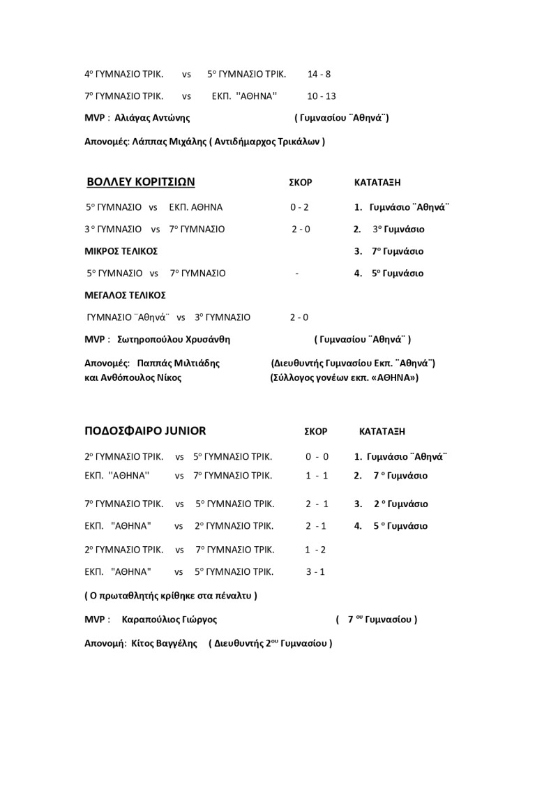 Περισσότεροι από 200 μαθητές – μέλη των ομάδων μπάσκετ, βόλεϊ και  ποδοσφαίρου, πραγματοποίησαν εξαιρετικές εμφανίσεις. Η παρουσία  θεατών, γονέων αλλά και μαθητών, ήταν για ακόμη μια φορά πολύ μεγάλη  με αποτέλεσμα να δημιουργηθεί μια φανταστική ατμόσφαιρα.