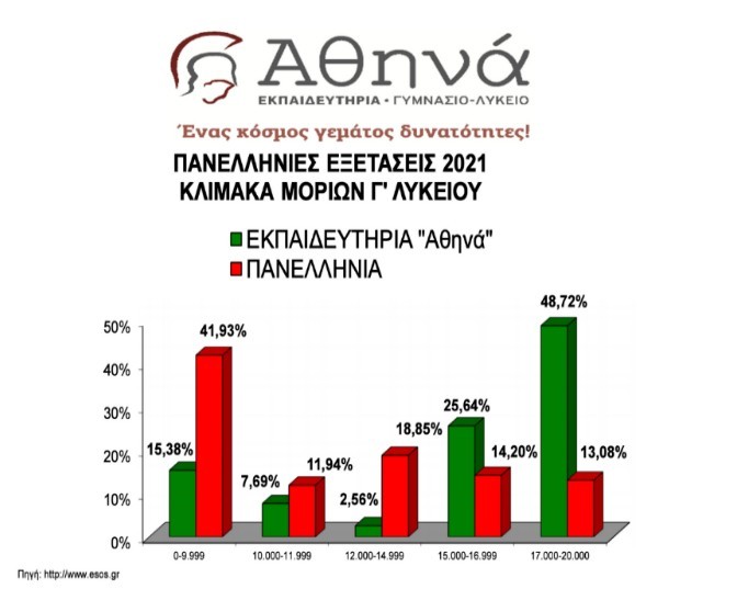 Το γράφημα παρουσιάζει τις επιδόσεις των Εκπαιδευτηρίων “Αθηνά” συγκριτικά με τις Πανελλήνιες Επιδόσεις.