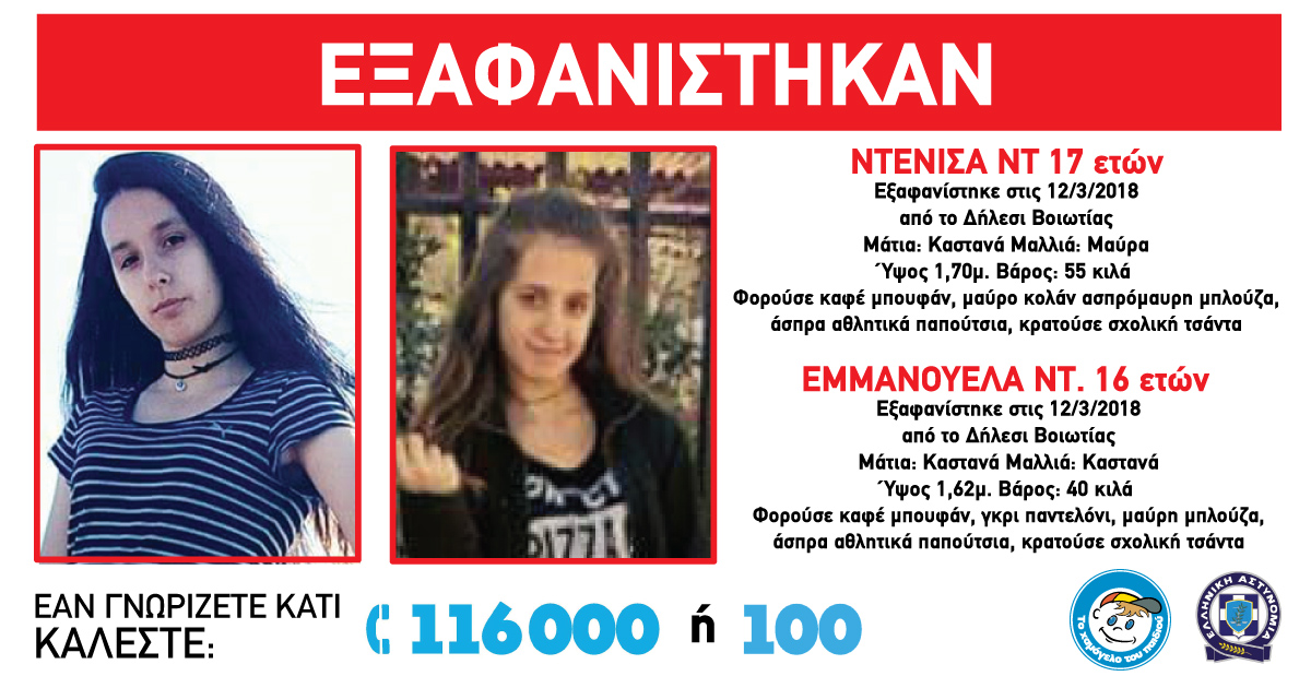 Στις 12/03/2018, πρωινές ώρες, εξαφανίστηκαν από το Δήλεσι Βοιωτίας, η Ντενίσα Ντ. 17 ετών και η Εμμανουέλλα Ντ. 16 ετών.