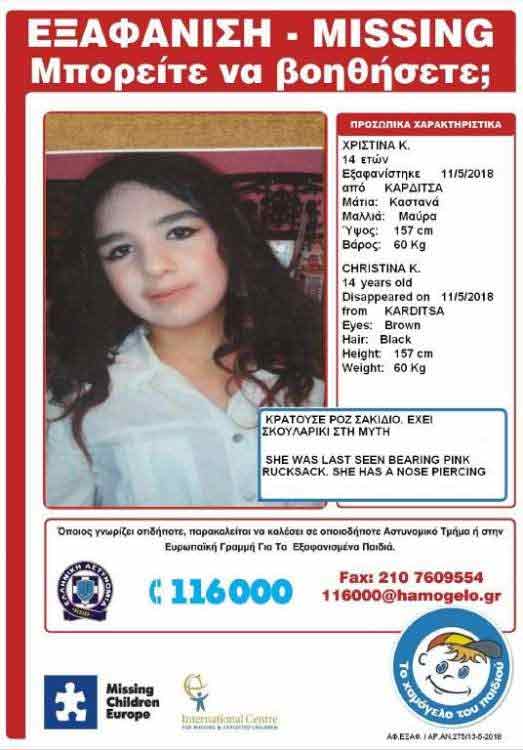 Από την Παρασκευή έχει εξαφανιστεί η 14χρονη Χριστίνα από την Καρδίτσα.