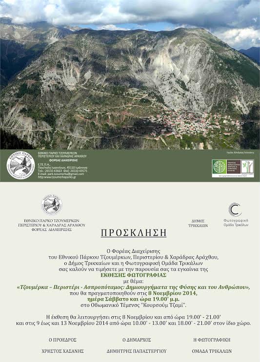 Ο Φορέας Διαχείρισης του Εθνικού Πάρκου Τζουμέρκων, Περιστερίου και Χαράδρας Αράχθου σε συνεργασία με το Δήμο Τρικκαίων και τη Φωτογραφική Ομάδα Τρικάλων ανακοινώνει τη λειτουργία έκθεσης φωτογραφίας, όπου θα παρουσιαστεί στο κοινό της πόλης των Τρικάλων τα θαυμάσια και μεγαλοπρεπή δημιουργήματα της φύσης και του ανθρώπου με τα οποία είναι σπαρμένη η προστατευόμενη περιοχή του Εθνικού Πάρκου.
