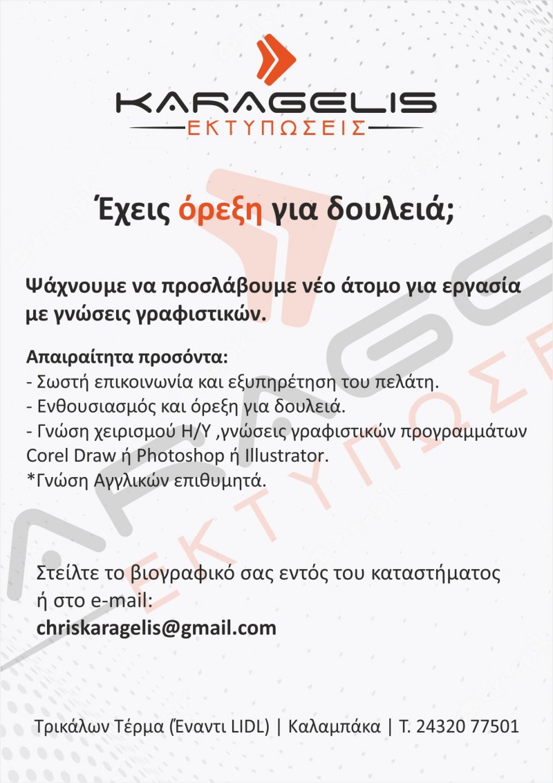 ΑΓΓΕΛΙΕΣ - ΕΡΓΑΣΙΑ Εκτυπώσεις KARAGELIS – Ζητείται άτομο για εργασία Από admin Δημοσίευση Αυγ 12, 2022 -15:22 0 1.287 Κοινοποίηση FacebookTwitterΗλεκτρονικό ΤαχυδρομείοViber Ζητείται άτομο για εργασία στις Εκτυπώσεις KARAGELIS στην Καλαμπάκα. Ακολουθεί η σχετική ανακοίνωση: 0 1.287 Κοινοποίηση