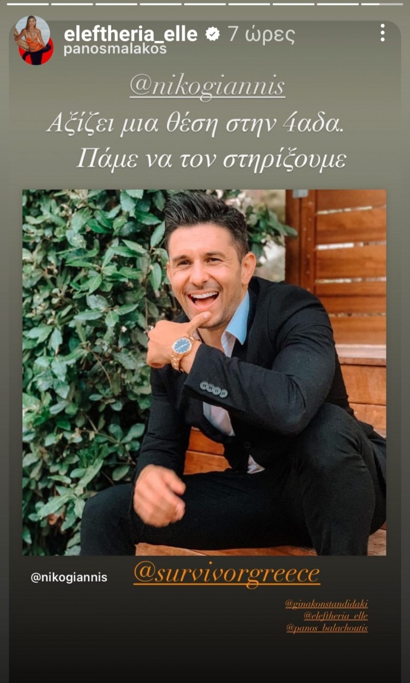 Τον φίλο της Νίκο Γιάννη στηρίζει η Ελευθερία Ελευθερίου ανοικτά και ζητά απ όλους μέσω του instagram να στηρίξουν τον συμπολίτη μας Νίκο Γιάννη για μια θέση στην τετράδα!