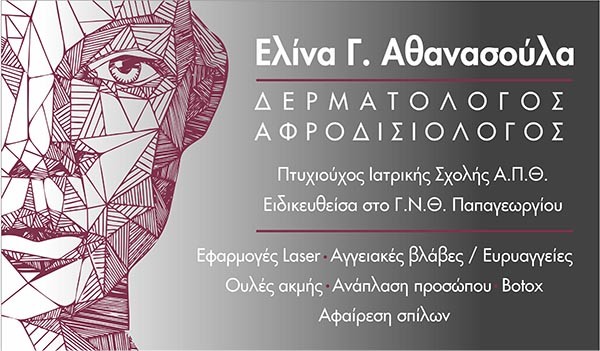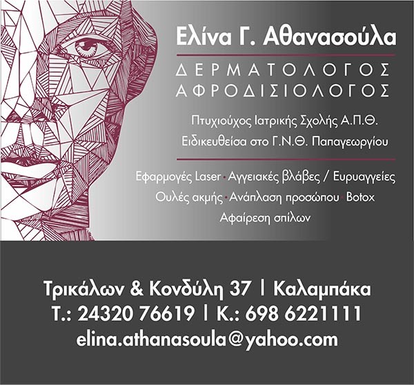 Η Ελίνα Αθανασούλα, Δερματολόγος – Αφροδισιολόγος προσφέρει τις υπηρεσίες της σε έναν ειδικά διαμορφωμένο επαγγελματικό χώρο στο κέντρο της πόλης μας, στην οδό Τρικάλων και Κονδύλη 37.