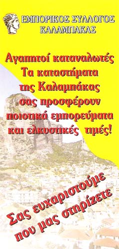 Συνεχίζει τις προσπάθειες του ο Εμπορικός Σύλλογος Καλαμπάκας για τόνωση της αγοράς με διαφημιστικά φυλλάδια που έρχονται στα σπίτια μας μέσω ΔΕΥΑΚ. Συνεχίζει τις προσπάθειες του ο Εμπορικός Σύλλογος Καλαμπάκας για τόνωση της αγοράς με διαφημιστικά φυλλάδια που έρχονται στα σπίτια μας μέσω ΔΕΥΑΚ. Το φυλλάδιο που έρχεται στα σπίτια όλων των δημοτών της Καλαμπάκας προτρέπει στην προτίμηση των καταστημάτων της Καλαμπάκας καθώς προσφέρουν ποιοτικά εμπορεύματα και ελκυστικές τιμές. Μια ακόμη κίνηση του Εμπορικού Συλλόγου μετά τις επιτυχημένες προσπάθειες που έγιναν κατά καιρούς με τις διαφημιστικές καμπάνιες και τα καλά δώρα. Ας στηρίξουμε όλοι την τοπική αγορά. Όλοι βγαίνουμε κερδισμένοι…