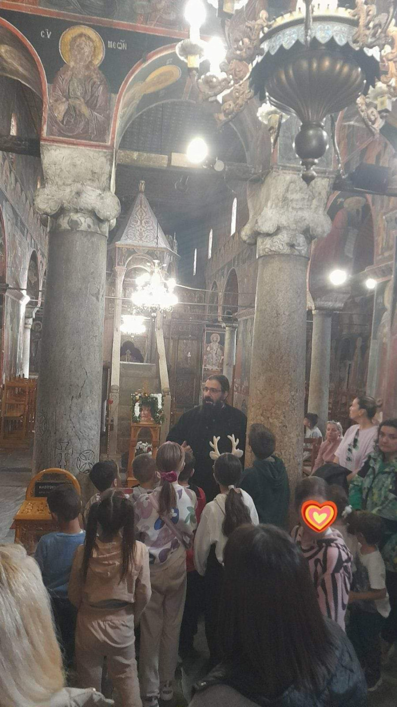 Εκεί τους υποδέχτηκε με χαρά ο π. Ιωάννης Κουβελάς, τους ξενάγησε και τους μίλησε για την ιστορία του βυζαντινού ναού.