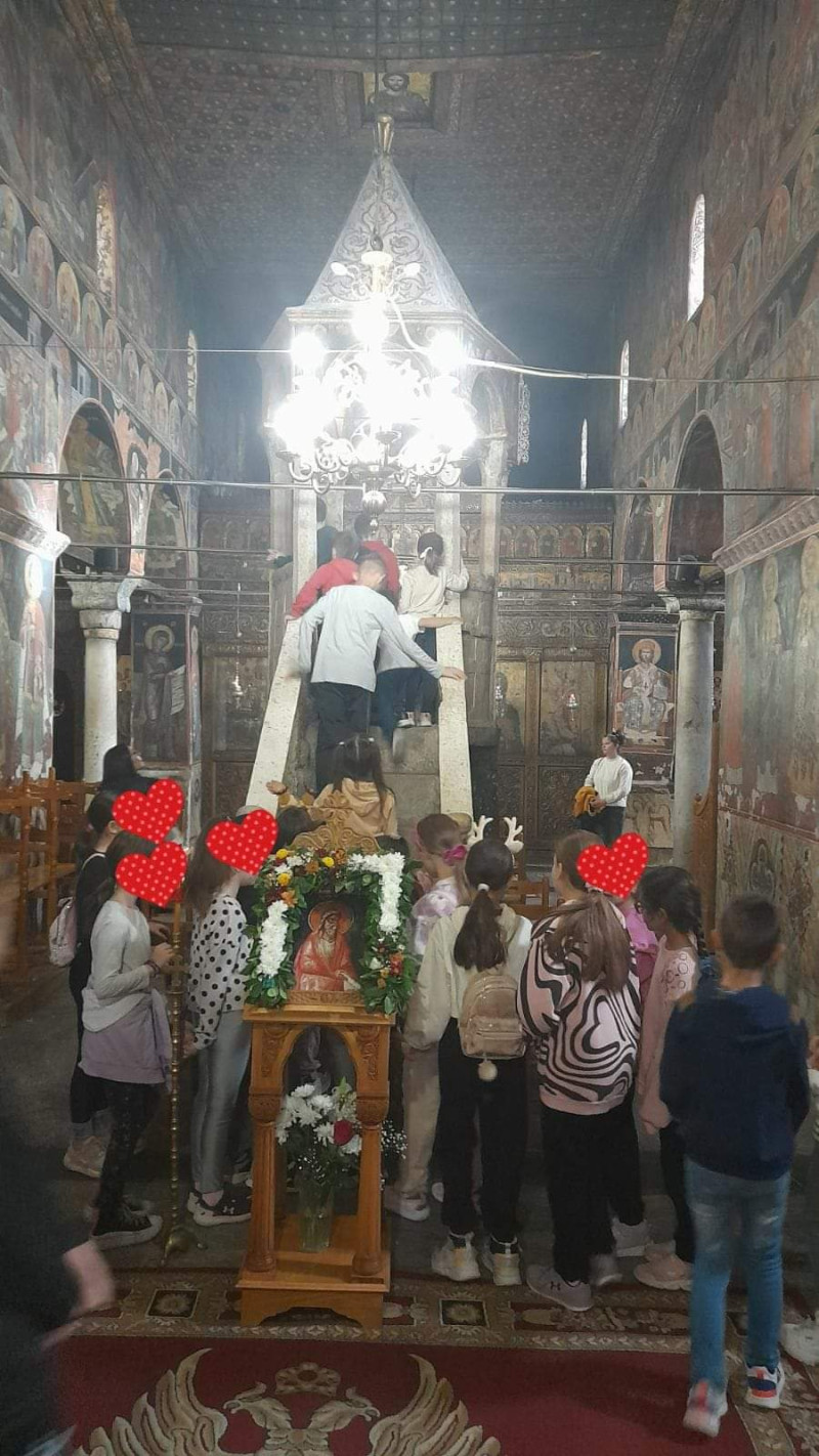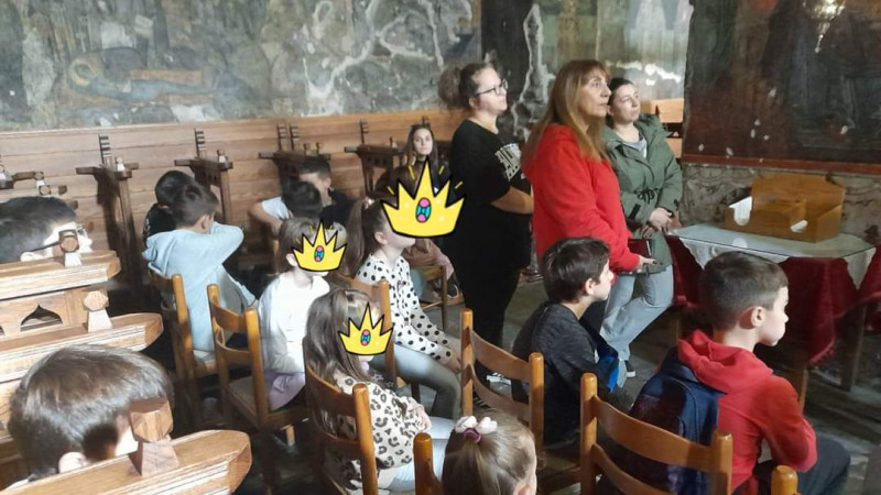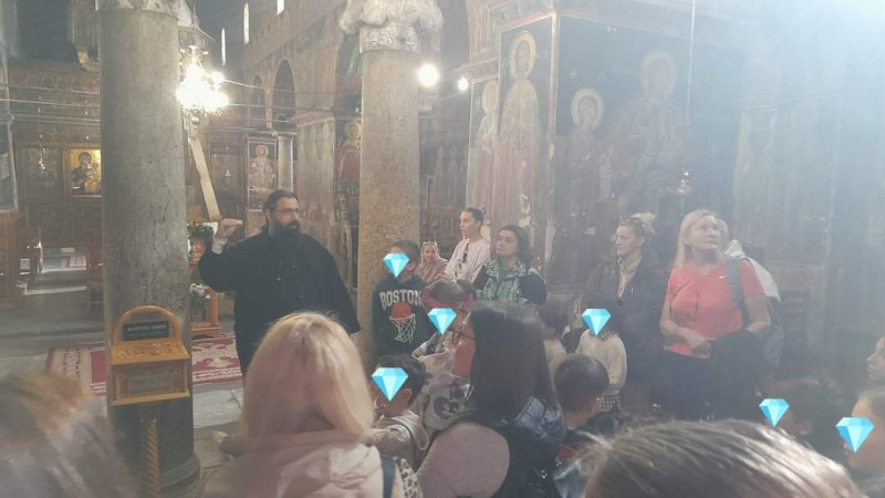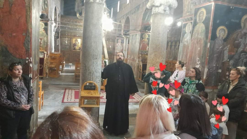 Εκεί τους υποδέχτηκε με χαρά ο π. Ιωάννης Κουβελάς, τους ξενάγησε και τους μίλησε για την ιστορία του βυζαντινού ναού.