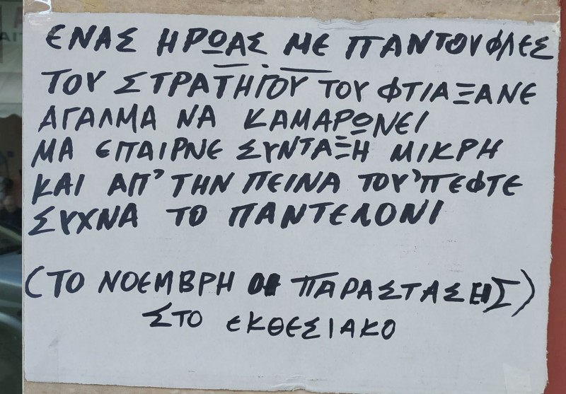 Σχετικά με την γνωστή παλιά κινηματογραφική ταινία “Ένας ήρωας με παντούφλες” έχει αναρτήσει αυτή τη φορά ο φίλος μας κομμωτής Κώστας Παγώνης έξω από το κουρείο του..