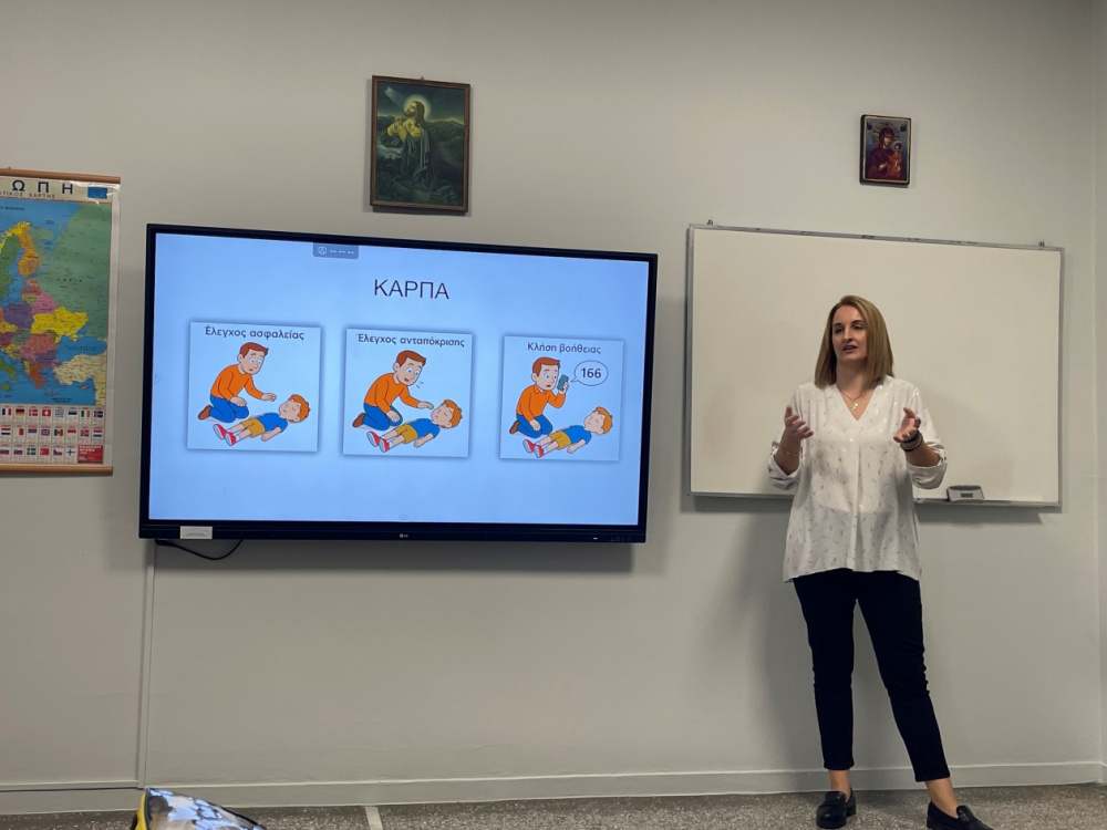 Η κ. Γάτσια, ολοκληρώνοντας την εισήγησή της, προσέφερε στο σχολείο μας μια συσκευή αντιμετώπισης πνιγμού, ενισχύοντας ακόμη περισσότερο την ετοιμότητα και την ασφάλεια της σχολικής μας κοινότητας. Στο τέλος, συνόψισε με σαφήνεια ορισμένες βασικές αλλά καθοριστικές οδηγίες για τους εκπαιδευτικούς, τονίζοντας την ανάγκη για άμεση αντίδραση, ψυχραιμία και σωστή εφαρμογή των πρωτοκόλλων σε κάθε επείγον περιστατικό.