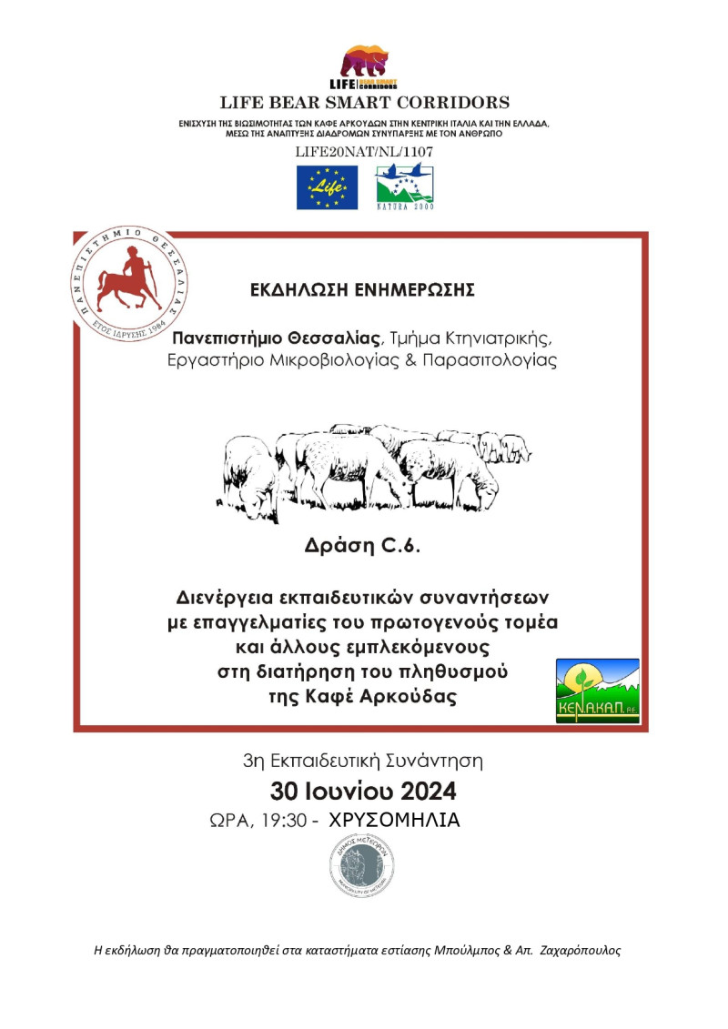 Στο πλαίσιο της Δράσης C.6 του έργου, το Εργαστήριο, σε συνεργασία με επιστήμονες και επαγγελματίες του πρωτογενούς τομέα, διοργανώνει σειρά εκπαιδευτικών συναντήσεων με τους παραγωγούς που δραστηριοποιούνται σε περιοχές εντός των γεωγραφικών ορίων του Δήμου Μετεώρων, όπου υπάρχει ενεργή παρουσία ατόμων καφέ αρκούδας.