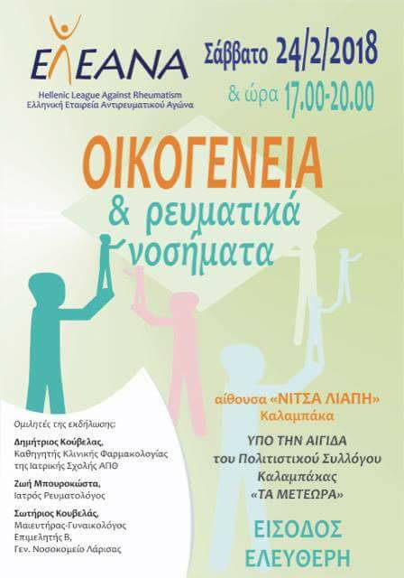 Η Ελληνική Εταιρεία Αντιρευματικού Αγώνα με την αιγίδα του Πολιτιστικού Συλλόγου Καλαμπάκας «ΤΑ ΜΕΤΕΩΡΑ» διοργανώνει το Σάββατο 24 Φεβρουαρίου 2018 και ώρα 17:00-20:00 ενημερωτική εκδήλωση στην αίθουσα «ΝΙΤΣΑ ΛΙΑΠΗ».