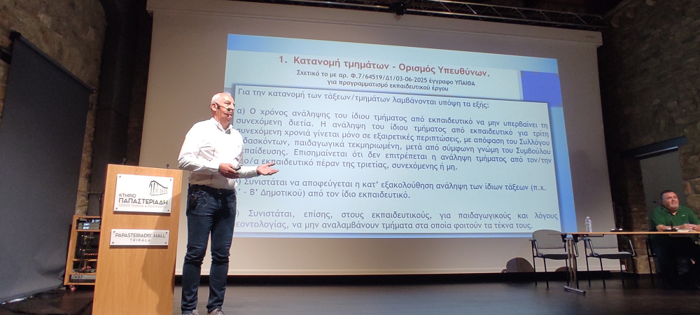 Η Διεύθυνση Πρωτοβάθμιας Εκπαίδευσης Τρικάλων διοργάνωσε ενημερωτική συνάντηση για τους διευθυντές και τις προϊσταμένες των σχολείων του νομού. Στόχος της συνάντησης, που πραγματοποιήθηκε τη Δευτέρα 1 Σεπτεμβρίου 2025 στο κτήριο «Παπαστεριάδη», ήταν η ομαλή έναρξη της νέας σχολικής χρονιάς.