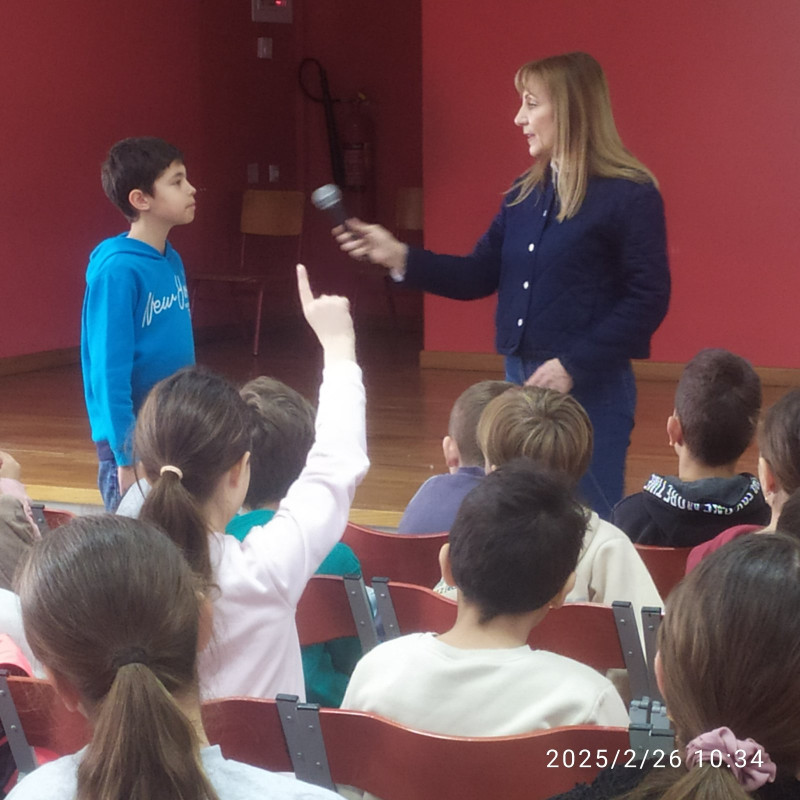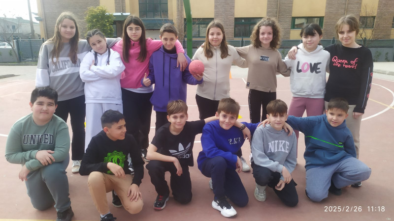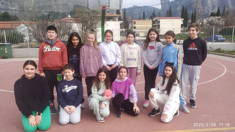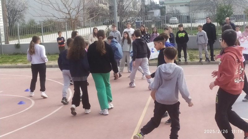 Στη συνέχεια οι μαθητές των Ε΄ και ΣΤ΄ τάξεων με την εκπαιδευτικό Φυσικής Αγωγής του σχολείου κα. Οικονόμου Δήμητρα έπαιξαν αγώνα Χάντμπολ, με φιλάθλους τους υπόλοιπους μαθητές του σχολείου. Οι «φίλαθλοι» υποστήριζαν την ομάδα τους φωνάζοντας τα συνθήματά τους.