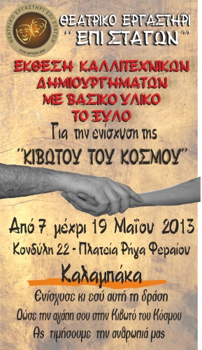 Έως τις 19 Μαϊου θα διαρκέσει η έκθεση Καλλιτεχνικών Δημιουργημάτων με βασικό υλικό το ξύλο του Θεατρικού Εργαστηρίου “Επί Σταγών”.