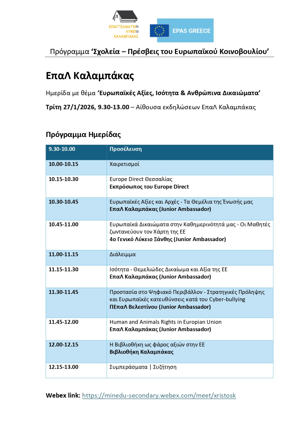 ΕΠΑΛ Καλαμπάκας: Ημερίδα με θέμα “Ευρωπαϊκές Αξίες, Ισότητα και Ανθρώπινα Δικαιώματα” Τοπικές Ειδήσεις Από admin Δημοσίευση Ιαν 26, 2026 -14:58 0 18 Κοινοποίηση FacebookTwitterΗλεκτρονικό ΤαχυδρομείοViber Ημερίδα με θέμα ‘Ευρωπαϊκές Αξίες, Ισότητα & Ανθρώπινα Δικαιώματα’ την Τρίτη 27/1/2026, 9.30-13.00 στην Αίθουσα εκδηλώσεων ΕπαΛ Καλαμπάκας. 0 18 Κοινοποίηση