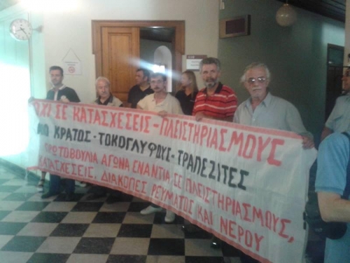 Στην προσπάθειά τους να διασφαλίσουν την επαίσχυντη διαδικασία αρπαγής λαϊκών περιουσιών με την είσοδο στην αίθουσα των συμβολαιογράφων και δικηγόρων, οι αστυνομικές δυνάμεις απώθησαν με τη βία τους συγκεντρωμένους διαδηλωτές.