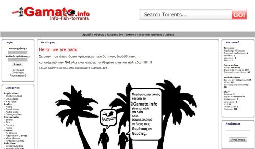 Ως igamato.info επέστρεψε η ιστοσελίδα gamato.info που είχε κλείσει πριν καιρό λόγω σύλληψης των administrators. Aξίζει να σημειώσουμε πως μέσα σε μόλις 30 λεπτά το δημοφιλέστατο site διανομής torrent, μετράει ήδη πάνω από 5000 μέλη. Σημειώστε επίσης πως πρέπει να διαβάσετε με προσοχή τους όρους πριν την εγγραφή σας. Όπως είδαμε όσοι ανεβάζουν torrent ή οποιοδήποτε άλλο υλικό θα είναι οι ίδιοι αποκλειστικά υπεύθυνοι και σε περίπτωση δίωξης θα… υποστούν οι ίδιοι τις συνέπειες και όχι το igamato.
