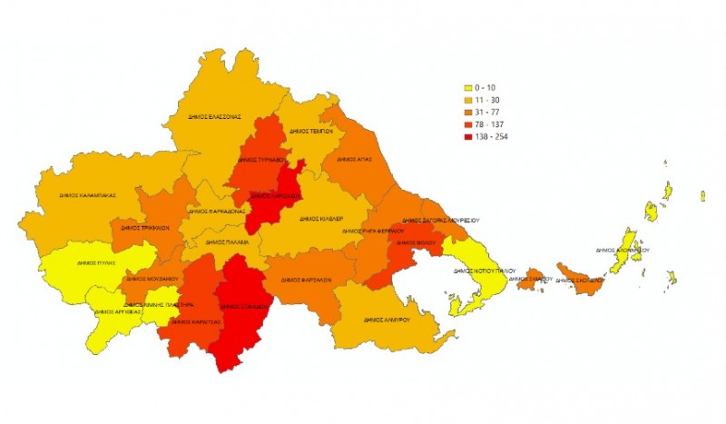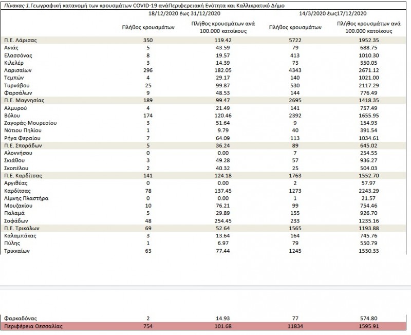 Ο παρακάτω πίνακας και οι χάρτες αποτυπώνουν τη γεωγραφική κατανομή των συνολικών κρουσμάτων και της επίπτωσης COVID-19 από 14 Μαρτίου έως 17Δεκεμβρίου και από 18 έως 31 Δεκεμβρίου ανά Καλλικρατικό Δήμο της Περιφέρειας Θεσσαλίας, με βάση την δηλωθείσα διεύθυνση μόνιμης κατοικίας του κρούσματος ή τη διεύθυνση προσωρινής διαμονής για τους τουρίστες και άλλους προσωρινά διαμένοντες στην Ελλάδα. Συμπεριλαμβάνονται τόσο κρούσματα με ιστορικό ταξιδίου (“εισαγόμενα”) όσο και κρούσματα με πιθανή εγχώρια μετάδοση.