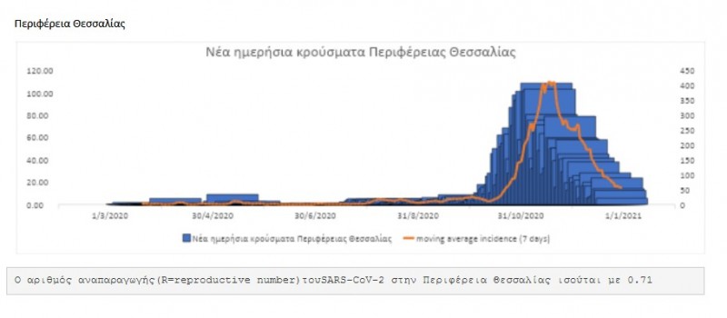Παρακάτω παρουσιάζεται η ημερήσια κατανομή των επιβεβαιωμένων κρουσμάτων και ο αριθμός αναπαραγωγής R (R=reproductive number) για την Περιφέρεια Θεσσαλίας. Μαζί με την επιδημική καμπύλη παρουσιάζεται και ο κυλιόμενος μέσος όρος επίπτωσης του νοσήματος COVID-19 των τελευταίων 7 ημερών (movingaverageincidence). Για τον αριθμό αναπαραγωγής Rχρησιμοποιήθηκε διάστημα έξι ημερών από την ημερομηνία δήλωσης ως πιθανή ημερομηνία μόλυνσης από τον νέο κορωνοϊό (COVID-19).