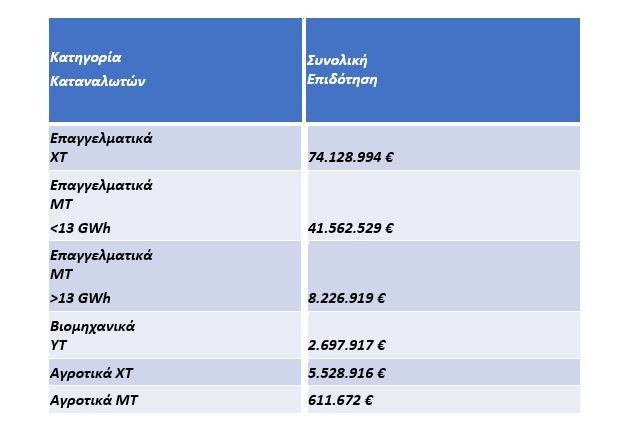 Τέλος, σε ό,τι αφορά στους εμπορικούς καταναλωτές και τις βιομηχανίες, επεκτείνεται η επιδότηση, ανεξαρτήτως μεγέθους και τζίρου, στα 30 ευρώ ανά μεγαβατώρα με το ύψος του μέτρου να αγγίζει τα 51 εκατ. ευρώ.