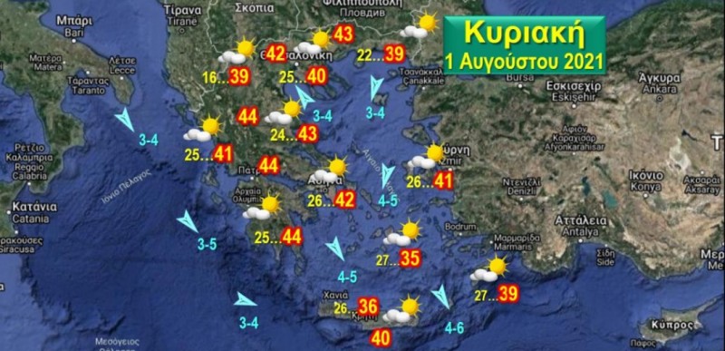 Άνεμοι: Βοριάδες στα πελάγη 4-5 Μποφόρ. Θερμοκρασίες: Στα βόρεια ηπειρωτικά από 16 έως 42-43, στα δυτικά, κεντρικά και νότια ηπειρωτικά από 24 έως 42-44, στο νησιά του Ιονίου, του βόρειου και ανατολικού Αιγαίου και τα Δωδεκάνησα από 26 έως 41, στις Κυκλάδες και την Κρήτη από 26 έως 35 στη νότια Κρήτη έως 40 βαθμούς.