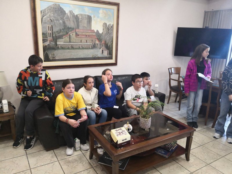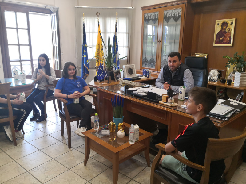Ανεβαίνοντας στον δεύτερο όροφο του Δημαρχείου μας υποδέχτηκε η κ. Λίλα, μιλήσαμε μαζί της, μας έδωσε γλυκά και καραμέλες, συναντήσαμε την κ. Μαρία Φροσυνάκη, τον κ. Κώστα Πρεβέντη και μετά μπήκαμε στο γραφείο του Δημάρχου.