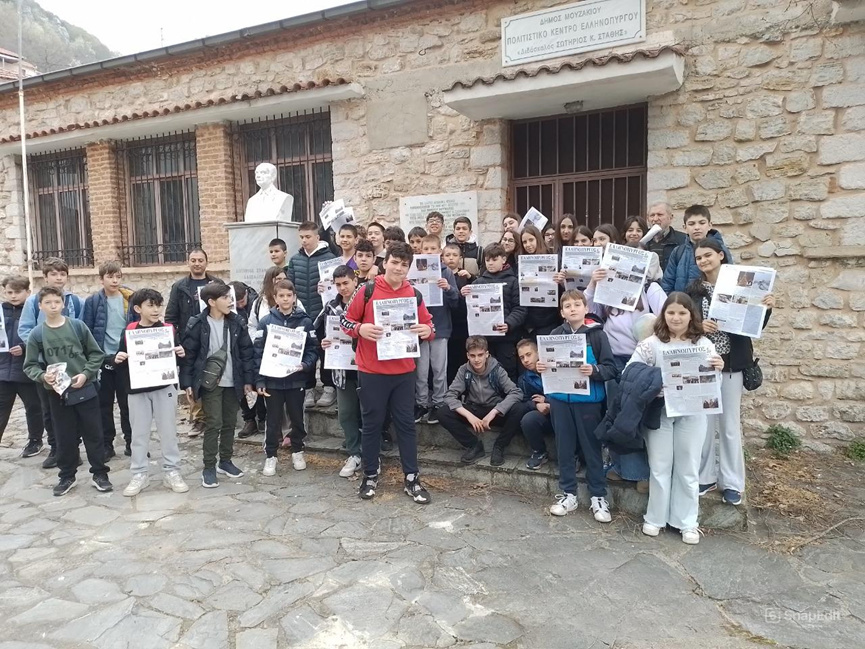 Εικόνα 7- Στο Πολιτιστικό Κέντρο Ελληνοπύργου (πρώην Δημοτικό Σχολείο) με την τοπική εφημερίδα “ΕΛΛΗΝΟΠΥΡΓΟΣ” ανά χείρας