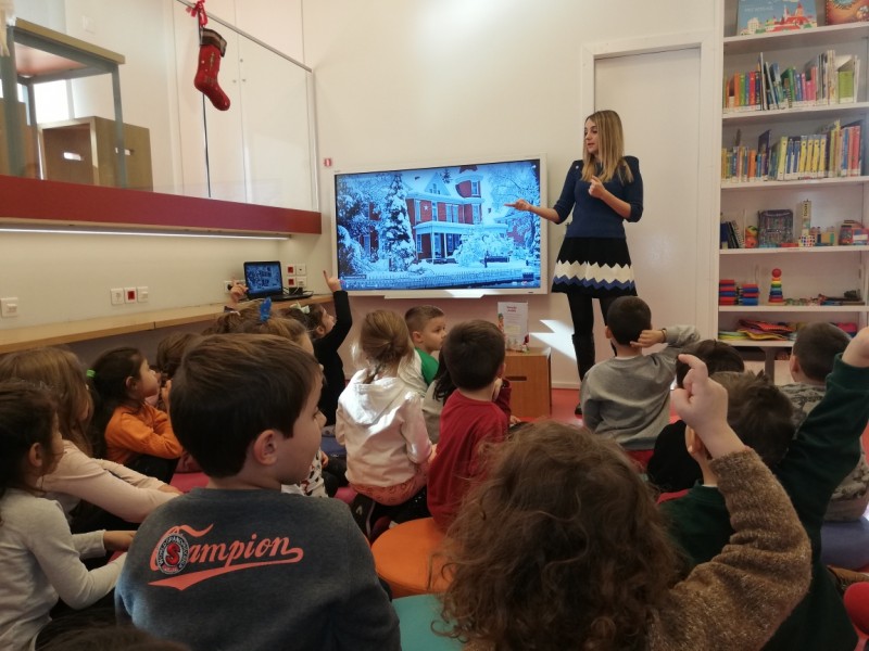 Αρχικά πραγματοποιήθηκε αφήγηση Χριστουγεννιάτικου παραμυθιού από τη Διευθύντρια και Βιβλιοθηκονόμο και στη συνέχεια τα παιδιά είχαν την ευκαιρία να παίξουν με τις εκπαιδευτικές εφαρμογές του Διαδραστικού πίνακα.